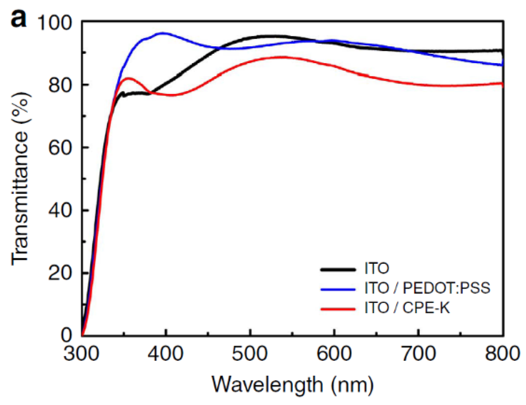 Comparison of the transmittance between PEDOT:PSS and CPE-K (poly[2,6-(4,4-bis-potassiumbutanylsulfonate-4H-cyclopenta-[2,1-b;3,4-b′]-dithiophene)-alt-4,7-(2,1,3-benzothiadiazole)]) on the ITO substrate [39].