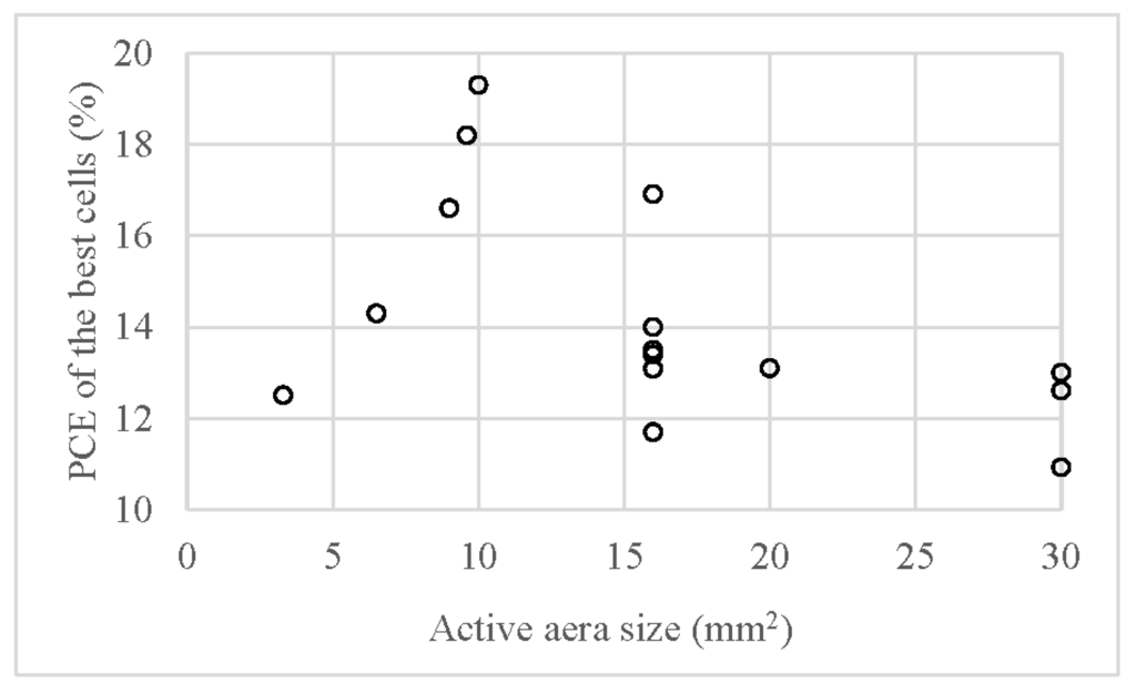 Relation between active area size and overall performance of perovskite solar cells reviewed in this work (all cells are characterized under AM1.5 illumination, 100 mW·cm−2).