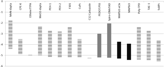 | Material | MeN-datpta | CPE-K | EtheneTTPA | MeO2-datpa | PEH-1 | PEH-2 | F101 | CuPc | C12 Carbazole | PEDOT:PSS | Spiro-OMeTAD | MAPbI3−xClx | MAPbI3 | Poly-TPD | TAE-1 | SubPc |