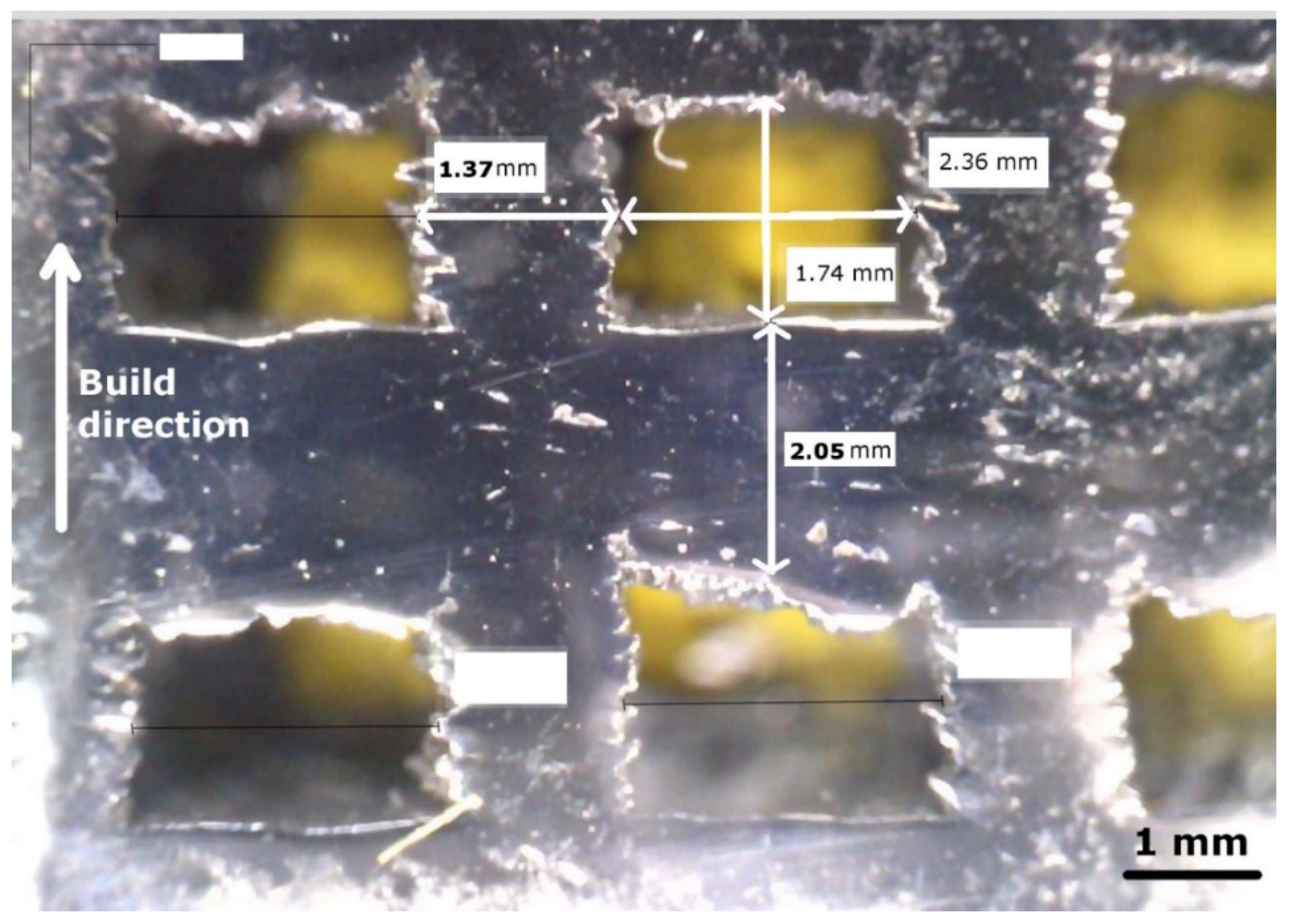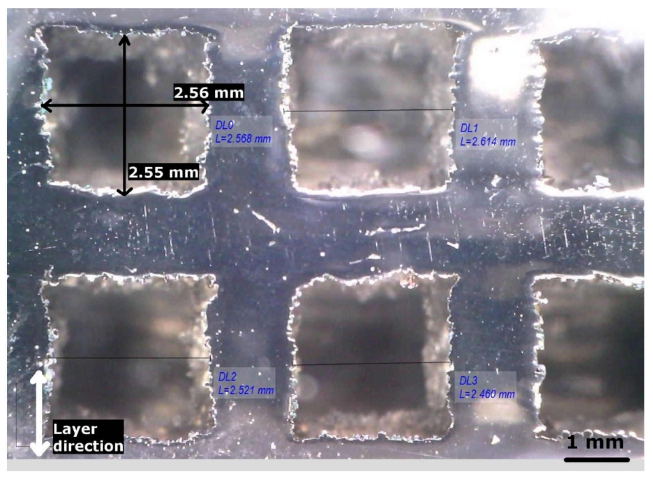 In the XY plane, the horizontal struts were uniform in size (Figure 7), and the pores were closer to square in shape (~2.56 × 2.55 mm). In the Z plane, though, the pores were more rectangular (~2.36 × 1.74 mm) (Figure 5). This difference means that the pores tend to be anisotropic in EBM structures. If this anisotropy is undesirable, the horizontal and vertical struts should then be designed with different sizes.