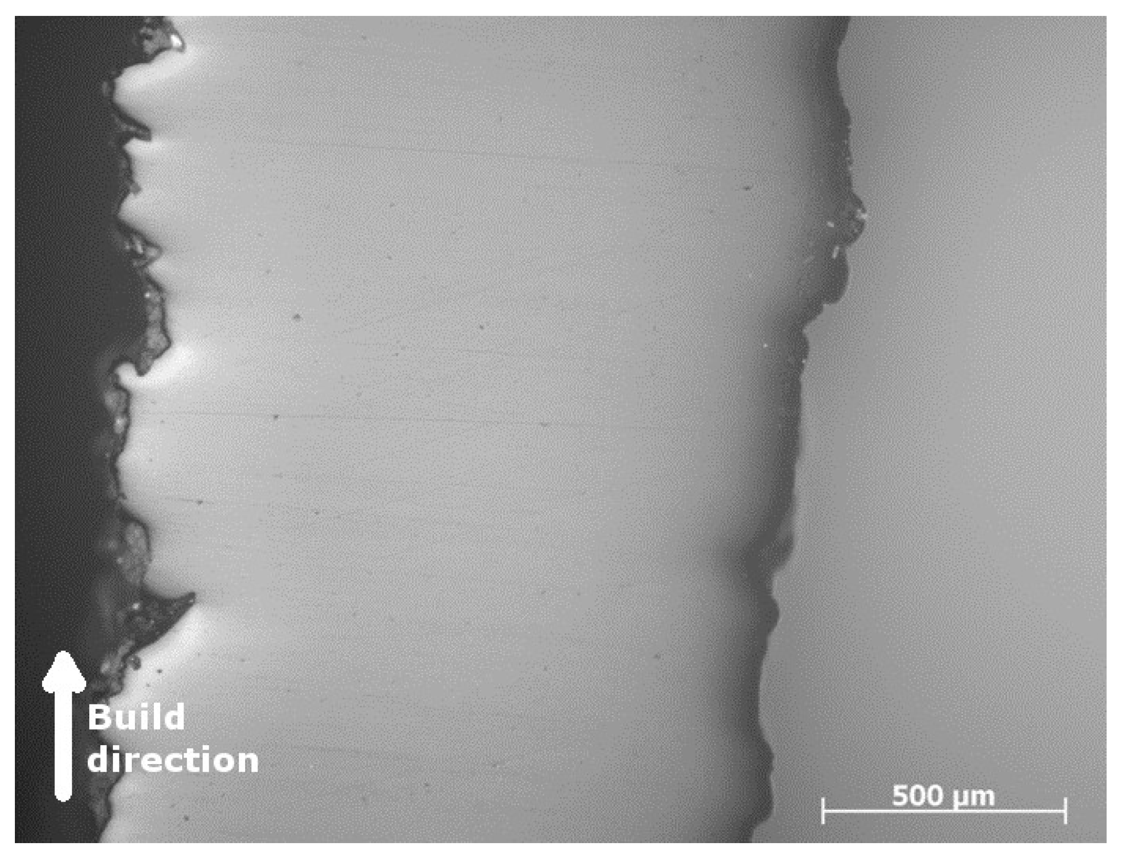 High-magnification optical micrograph showing 1.5 mm vertical strut produced with a standard scan strategy.