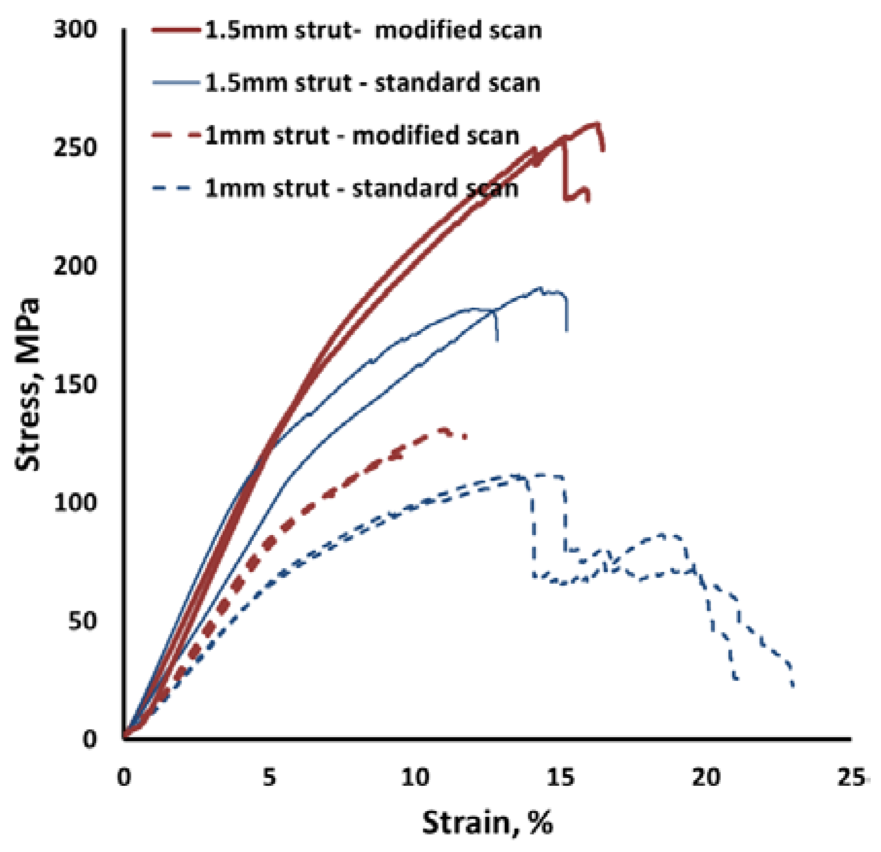 - A modified scan strategy (only hatching) produced 0.5 mm struts. This was possible because, in the modified scan strategy, the intense hatching beam imparted greater energy to the narrow regions required to build thin vertical struts.
