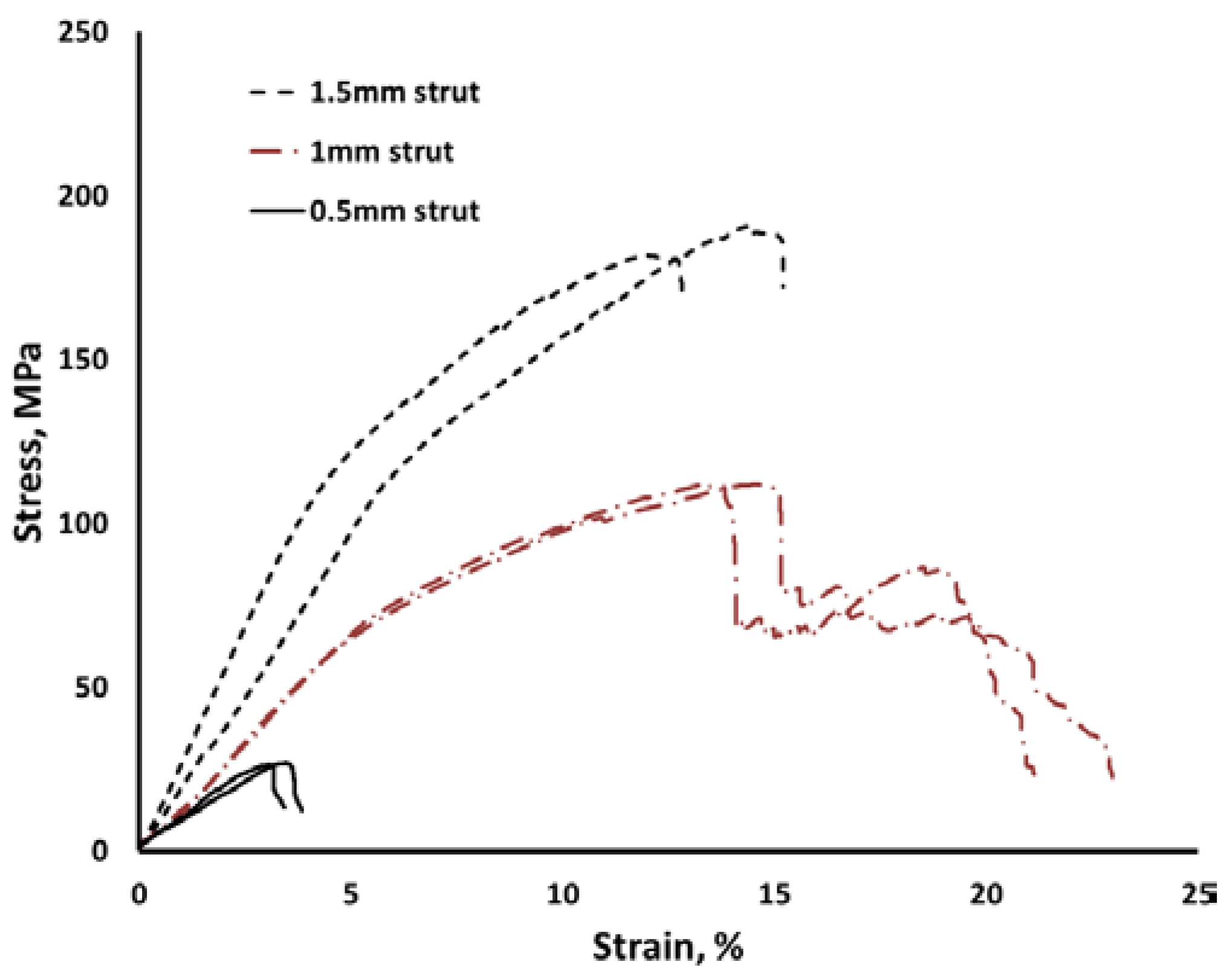 Effect of strut size on compressive properties of γ-TiAl porous structures (beam current of 18 mA).