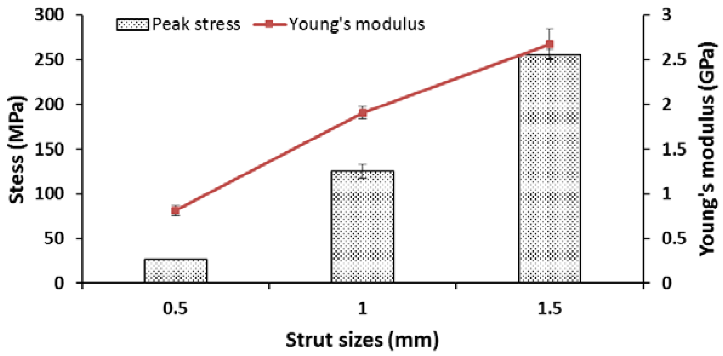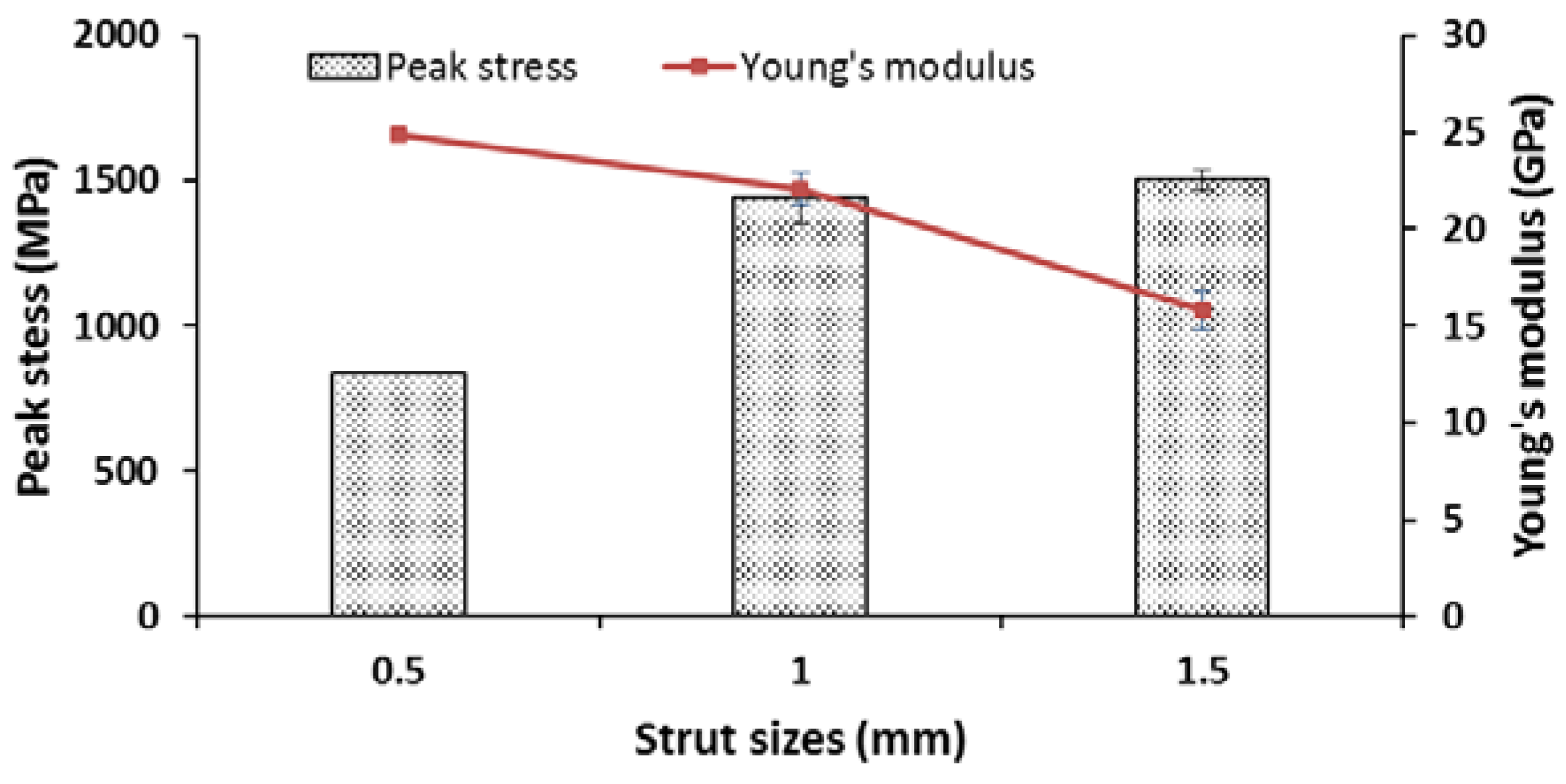Compressive properties were also evaluated taking into account only the strut area that contributes to the load bearing ability of the porous samples (Figure 21). The trend in the peak stress variation was similar to when the total sample cross-section was considered, i.e., the stress decreased with strut size. The drop in the stress from 1 mm to 0.5 struts was more drastic than from 1.5 mm to 1 mm struts. As the struts became thinner and thinner, the surface area increased (Table 2); consequently, the possibility of occurrence of surface defects also increases which ultimately affected the peak stress. The trend in Young’s modulus, however, was converse to the peak stress: the Young’s modulus was higher in thinner struts. This means that a unit area of material distributed into a greater number of load bearing columns behaved in a stiffer manner than when the same unit area of the material end up in a thicker, but with fewer number of columns. As previously mentioned, the linear elastic region of porous designs is shaped by how the cells bend elastically. The framework in 0.5 mm strut samples was fashioned from more number of struts and pores than other samples. Greater number of such cells, then, must have supported each other from easily bending and, hence, becoming stiffer in the process.