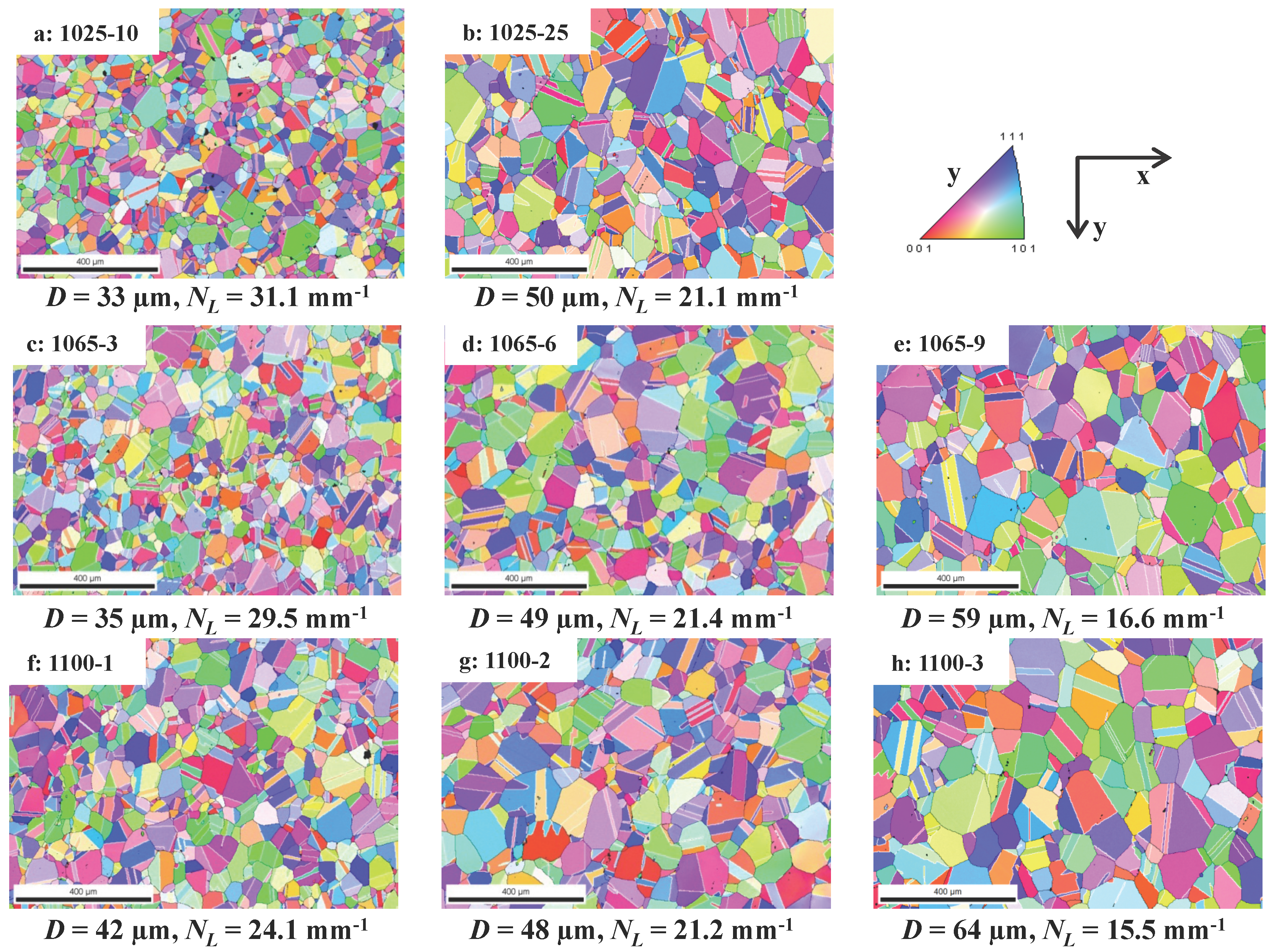 Microstructure evolution after annealing (same color code as in Figure 1a). (a) at 1025 °C for 10 min, (b) at 1025 °C for 25 min, (c) at 1065 °C for 3 min, (d) at 1065 °C for 6 min, (e) at 1065 °C for 9 min,(f) at 1100 °C for 1 min, (g) at 1100 °C for 2 min, (h) at 1100 °C for 3 min. The corresponding average grain size and annealing twin density are specified under each map. The white lines denote twin boundaries; the black lines are grain boundaries with a disorientation greater than 5°.