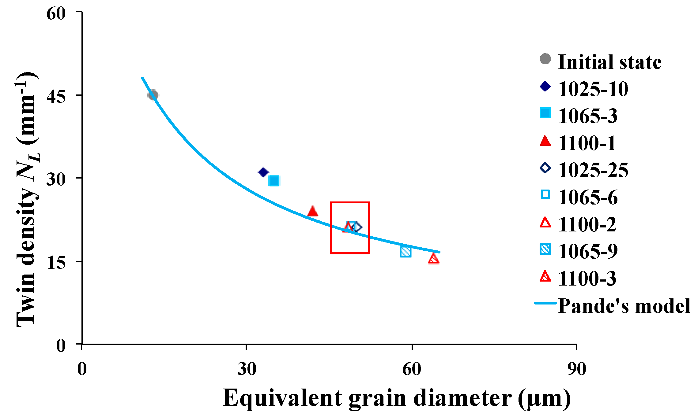 According to Pande [18], the annealing twin evolution depends on the grain boundary migration driving force and on the grain boundary migration distance (and therefore, on grain size). In order to test the influence of grain size on annealing twin development, microstructures with an identical average grain size of about 50 μm, but obtained at different annealing times and temperatures, were compared (highlighted by the red rectangle in Figure 3 and Figure 4). Despite the difference in grain growth kinetics at the three temperatures, the twin densities for the same average grain size (50 μm) are identical. Therefore, the twin density evolution appears to be independent of grain growth kinetics within the considered range. This observation is consistent with experimental data reported in the early literature [19].