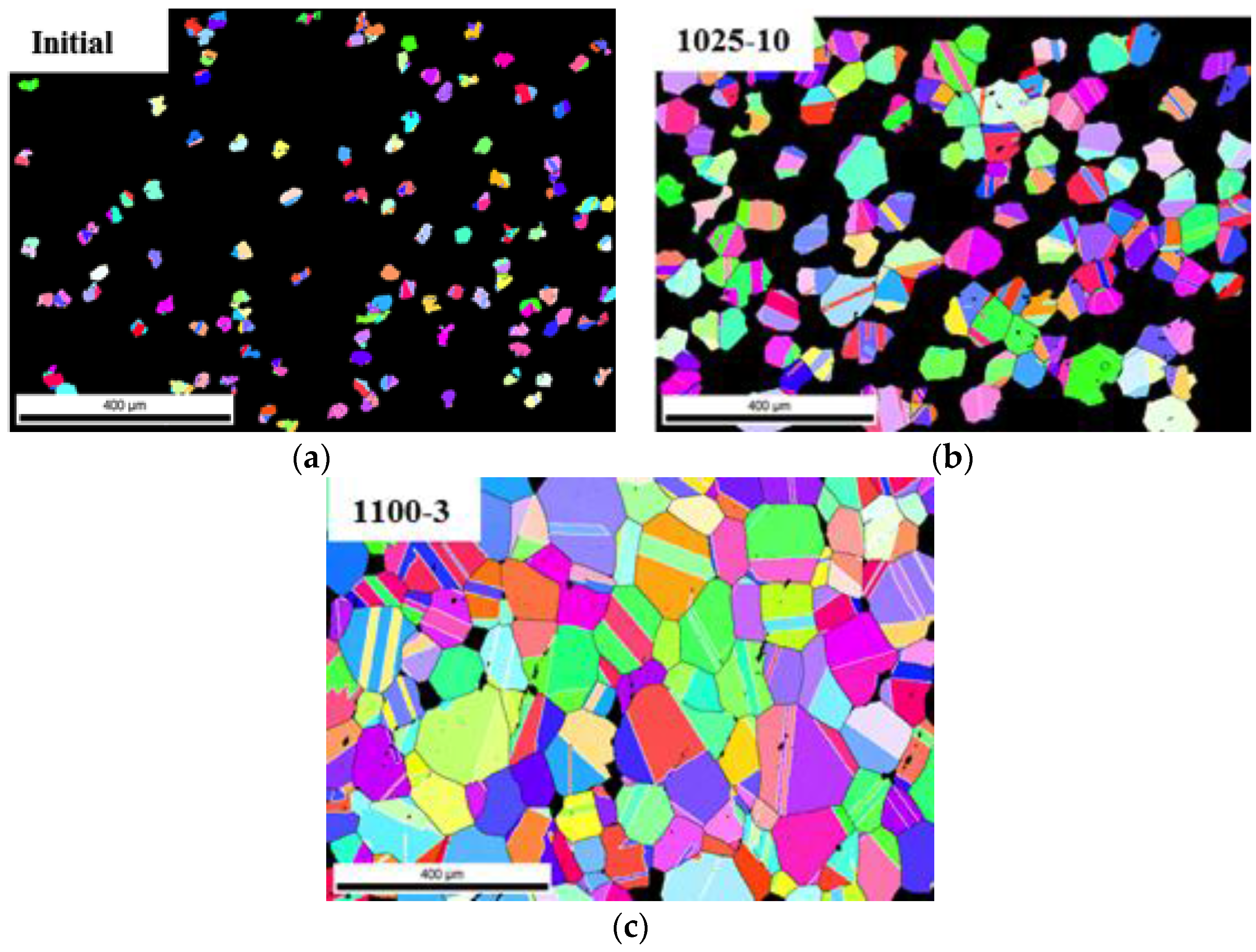 The (about 100) largest grains in (a) the initial microstructure, (b) the sample annealed at 1025 °C for 10 min and (c) the sample annealed at 1100 °C for 3 min. Same color code as in Figure 1.
