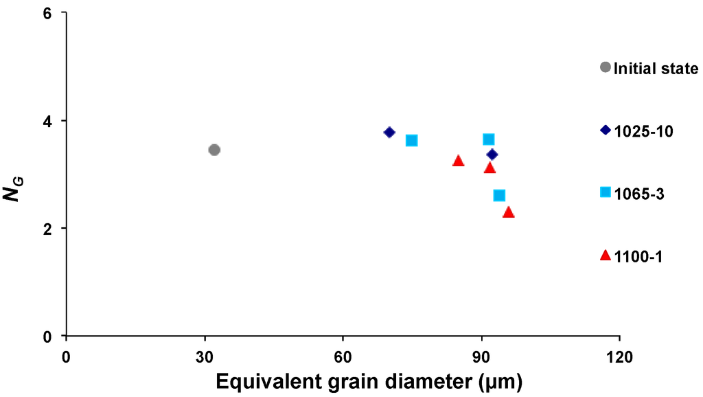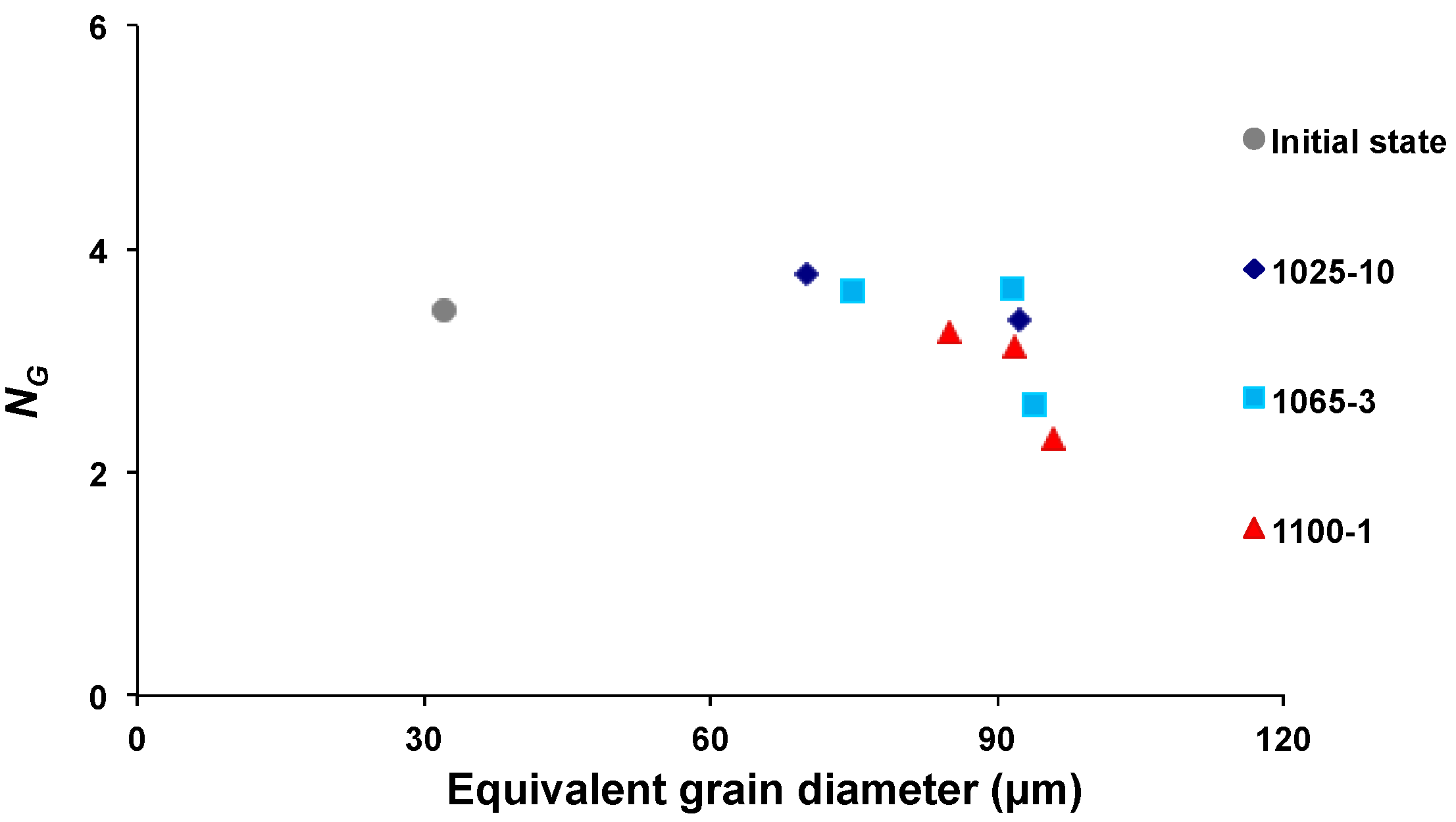 The recrystallized grains were identified in the EBSD maps using a criterion that the grain orientation spread (GOS) was less than 1° [12]. Twin boundaries were ignored in the grain detection procedure (except for determining the N2 value), and grains with an area smaller than three pixels were not considered. No additional clean-up was performed. The number-weighted average grain diameter (D) was used to quantify average grain size (equivalent grain diameter) in the following analyses.
