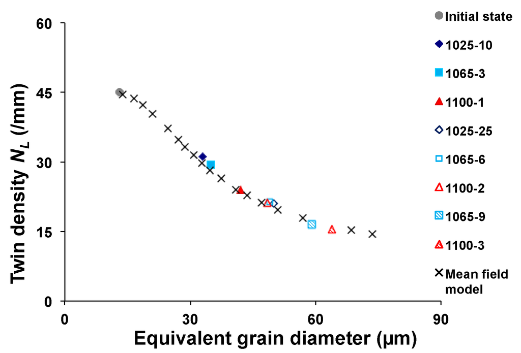 Furthermore, a 3D extension of the present mean field model could be considered, but will require 3D data as an input. The two-dimensional grain size distribution can be reasonably converted to an approached three-dimensional distribution [29]. However, the two-dimensional annealing twin boundary content cannot easily be converted to three-dimensional data. The application of the mean field model on the 3D dataset in [20] will be considered as a perspective of the present work.