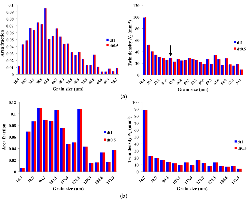 In addition, for the sake of determining the possible impact of the time step on the modeling results, the evolution of the grain size and twin density distributions at different stages of the mean field modeling using dt = 1 s and 0.5 s are shown in Figure 9. The modeling results using these two time steps are almost identical, which shows the convergence of the calculation.