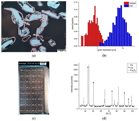 Structure of the coated powder before deformation: (a) Optical micrograph of a cross-section of powder particles after coating; (b) Grain size distributions of Cu and Fe phases after hot pressing as obtained from EBSD measurements; (c) Light micrograph of a cross-section of the hot-pressed coated powder. The white overlay indicates the EDX measurement areas and the numbers give the measured Cu contents in wt. %; (d) XRD pattern after hot pressing indicates a three-phase mixture of Fe, Cu and magnetite.
