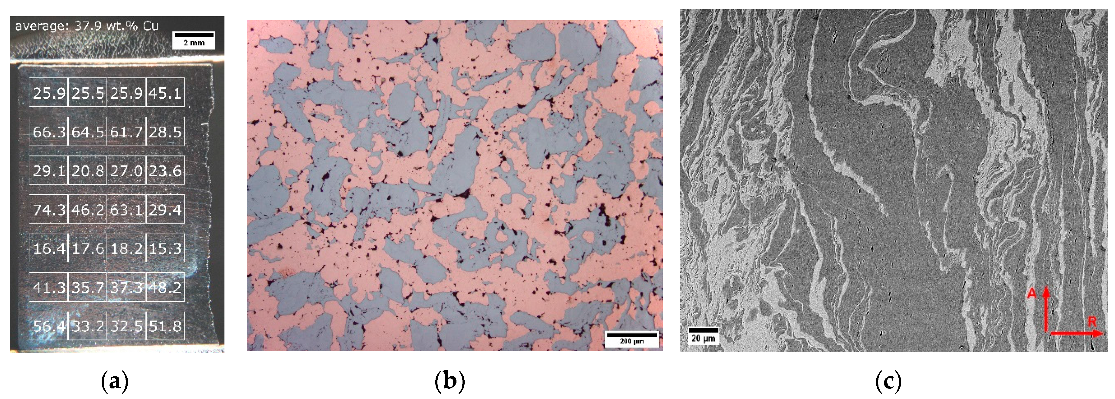 Structure of the powder mixtures before deformation: (a) Optical micrograph of a cross-section of the hot-pressed powder mixture. The numbers in the overlay give the Cu contents in wt. % as obtained from EDX with measuring regions indicated by the white grid; (b) Optical micrograph showing the coarse structure of the hot-pressed powder mixture (in a Cu-rich region); (c) Back-scattered electron micrograph of the pre-deformed powder mixture. The arrows indicate the axial (A) and radial (R) directions of the second HPT step.
