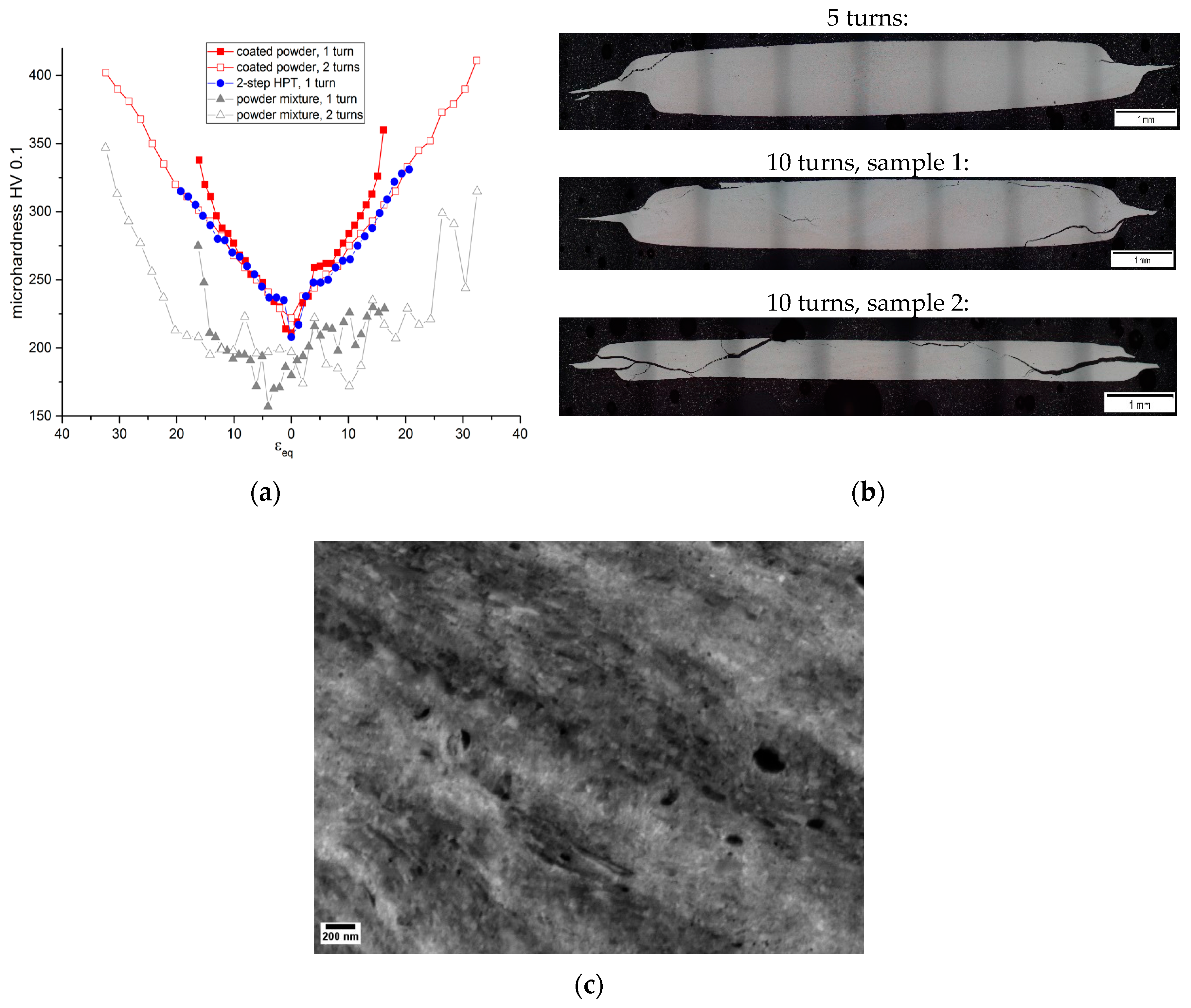 Whereas the powder mixtures with and without previous deformation are deformable up to extremely high strains (εeq > 1000), an increasing probability of crack formation with increasing strain is observed for the coated powder. After five turns (corresponds to εeq = 90 at the edge of the HPT disk), the first cracks occur at the edge of the sample. With further deformation, the number of cracks significantly increases (Figure 3b). We assume that these cracks are formed during unloading after deformation. Therefore, the hardness profiles were also measured for fractured samples, since the structure evolution during deformation and thus the hardness should not be influenced. Such materials are of no practical use, and a way to avoid the formation of cracks will be discussed in the next paragraph.