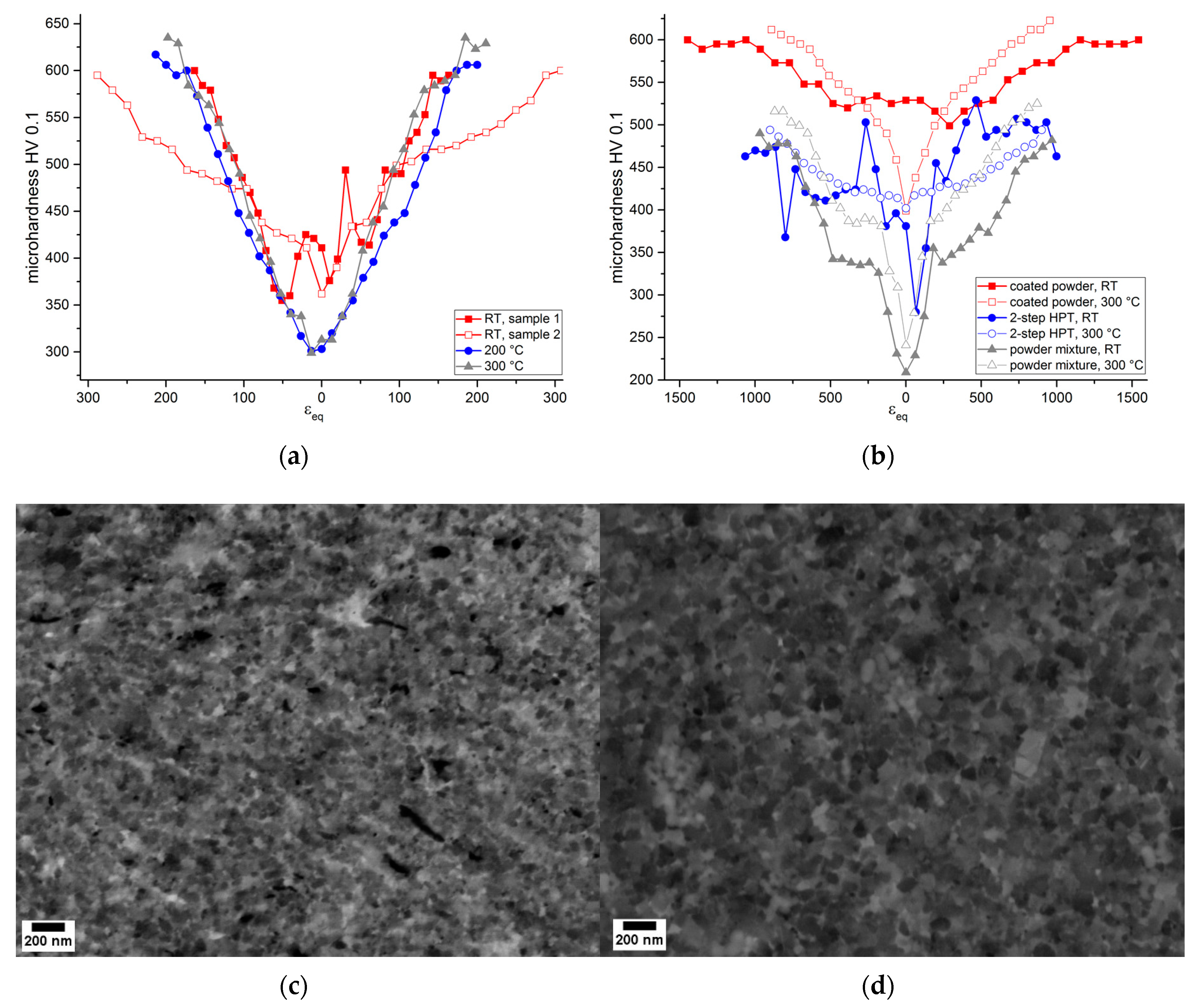 The effect of elevated temperature on the structure and hardness evolution: (a) Hardness profiles of HPT samples from coated powder after 10 turns at different temperatures (the differences between the two room-temperature samples can be attributed to different amounts of cracking, cf. Figure 3b); (b) Hardness profiles of HPT samples after 50 turns; Back-scattered electron micrographs of (c) coated powder and (d) pre-deformed (two-step HPT) powder mixture after 50 turns at 300 °C, measured at a radius of 3 mm (εeq = 700 without previous deformation).