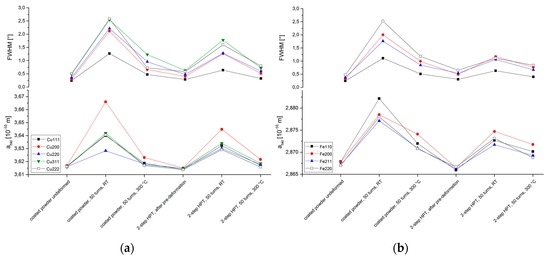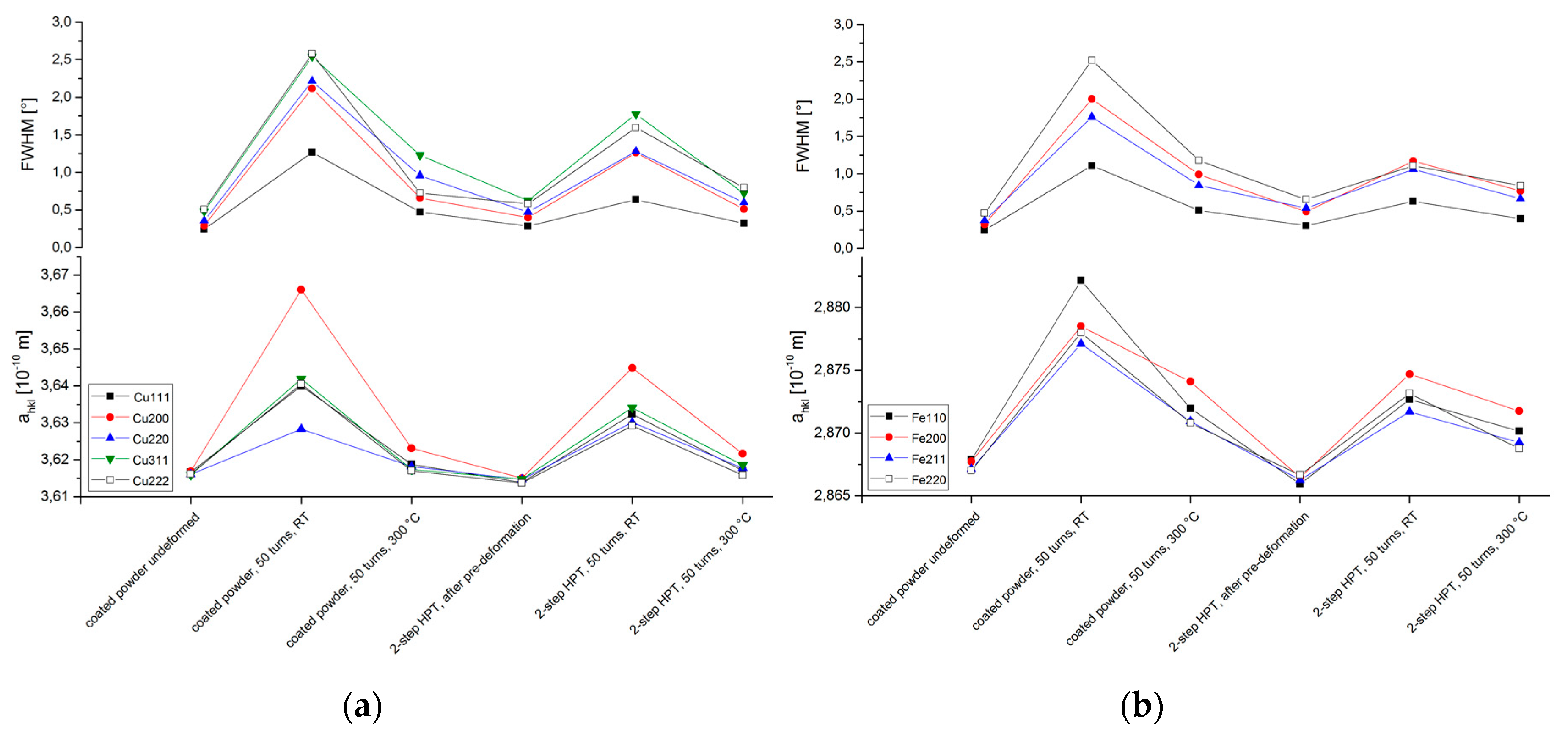 Peak width (full width at half maximum, FWHM) and lattice parameter calculated from the XRD peak positions, ahkl, for the (a) Cu and (b) Fe phases.