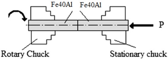 The Fe-40Al alloy was prepared with vacuum arc melting under an argon atmosphere from iron and aluminum with 99.99 wt. % and 99.7 wt. % purity, respectively. The samples were homogenized at 1100 °C for 50 h and cooled in a furnace. Cylindrical cast alloy samples 8 mm in diameter and 50 mm in length were prepared. The friction welding experiments were carried out by a continuous-drive friction welding machine [28] at different forging and friction pressures and friction times under a rotational speed of 1000 rmp (Table 1).