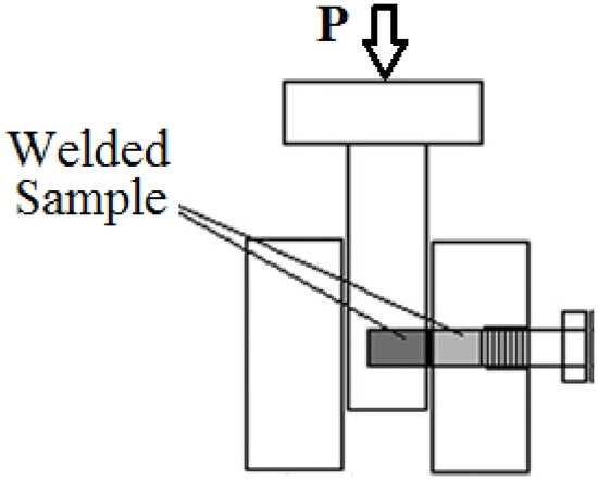 Shear tests were performed to determine the strength of the weld interface using an electromechanical universal test machine (Shimadzu AG-IS-250, OGÜ, Eskisehir, Turkey) at room temperature. A specially designed specimen holder (Figure 2) was used to measure the shear strength. Three samples were tested for each welding condition. The fractured surfaces of the welds were observed by SEM.