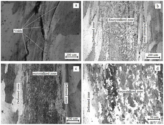 Optical micrographs of the welded samples under 200 MPa forging pressure and 140 MPa friction pressure. (a) 3 s; (b) 5 s; (c) 7 s; (d) higher magnification for 5 s.