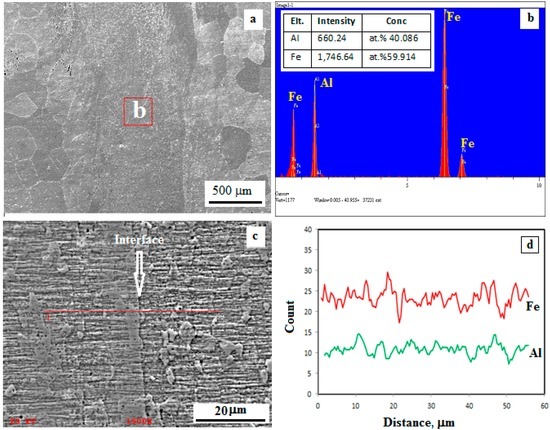 The SEM fractographs of the fractured surface of the welded sample for 7 s under 140 MPa friction pressure and 140 MPa forging pressure and the base metal are shown in Figure 8. The welded samples were inserted into the testing apparatus to fracture from the weld interface during the shear test. The shearing process was performed out the weld interface of the welded samples. Fractographs show that the fractured surface of welded sample has very fine grains with respect to the base alloy (Figure 8a). This finding confirms that failure took place at the recrystallized zone during the shear test. EDS analysis taken from the fractured surface revealed that the Fe and Al atoms exist on the fractured surfaces of welded sample for 7 s under 140 MPa friction pressure and 200 MPa forging pressure.