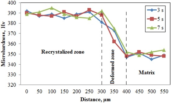 Hardness of the recrystallized zone is higher than that of the base alloy due to formation of very fine grains. In addition, hardness of the recrystallized zone can be increased by vacancy hardening due to rapid cooling from a high temperature after friction welding [11,12].