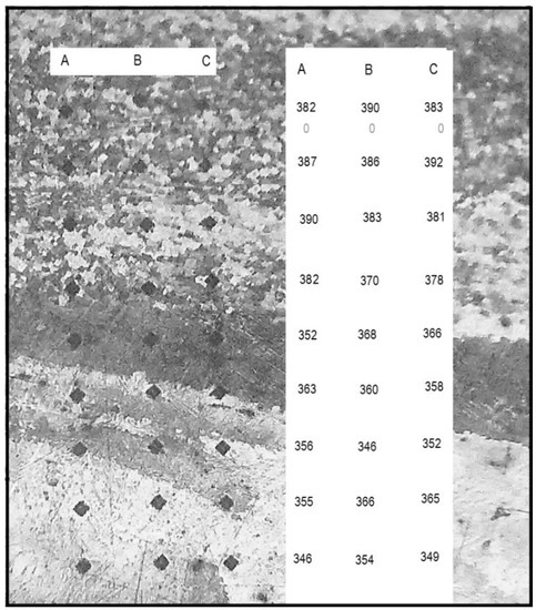 The friction welding process is given schematically in Figure 1. After welding, the welded samples were cut perpendicular to the welding interface. The surfaces of the welded samples were ground with 1200 grinding paper and polished with 1 µm diamond paste, then the samples were etched with a mixture consisting of H2O (30 mL), HNO3 (30 mL), HCl (20 mL), and HF (20 mL). The microstructures were observed under light microscopy (AKÜ, Afyonkarahisar, Turkey) and scanning electron microscopy (SEM, AKÜ, Afyonkarahisar, Turkey). The chemical compositions of the weld zone and the base alloy were determined by using energy dispersive spectroscopy (EDS, AKÜ, Afyonkarahisar, Turkey). Microhardness values were measured on the welded samples by means of Vickers indenter with a load of 100 g.