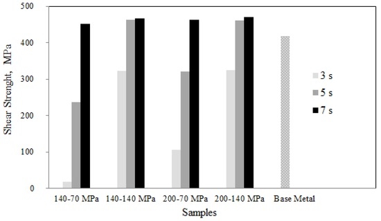 The shear strengths of weld interface of welded samples were determined by using a specially designed testing apparatus. The shear of the welds and the base alloy are shown in Figure 7. Test results demonstrated that the values of the shear strength of the welded samples increased with increasing of the friction time and friction pressure. It can be argued that the shear strength of welds was dependent on the friction time and pressure under the experimental conditions. The shear strength of welded samples for 3 s is much lower due to large voids at the welding interface. The forging pressure affected the shear strength values of the welded samples for 3 and 5 s under friction pressure of 70 MPa. The shear strength values increased with an increase in forging pressure for these times. However, the shear strength of the welds did not show an important change in other welding conditions. Under constant forging pressure conditions, the shear strength of the welds increased with increasing friction pressure. This observation indicates that the increase in the shear strength is related to the magnitude of the accumulated heat input, which depends on the friction time for low and high friction pressures. Test results demonstrate that the shear strength values of the welds are greater than that of the base metal. This situation shows that the structure with very fine grains formed due to dynamic recrystallization during the friction welding has higher strength than the matrix.