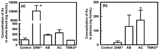 Rats are one of the most tolerant animal species to As, and As is known to accumulate in the red blood cells (RBCs) of rats following administration of iAs in the form of dimethylarsenical [29,30]. Lu et al. [31] reported that arsenic was bound to the α-chain of hemoglobin in the RBCs of rats that had been fed a DMAV-containing diet and that the main arsenical in RBCs was dimethylarsinous acid (DMAIII). The α-chain of rat hemoglobin includes a reactive cysteine 13 (Cys-13), and the lack of this cysteine in human hemoglobin may be responsible for the shorter retention of As in human blood compared to rat blood [32]. On the other hand, data on the arsenic speciation analysis of human RBCs are very limited. AB was detected in the RBCs of healthy male volunteers [33]. AB and dimethylarsenical were detected in the RBCs of humans who stopped drinking As-contaminated water two and five years before blood collection [34,35].