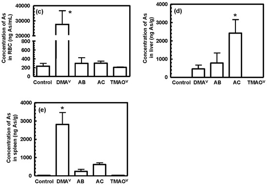 Concentrations of arsenic in (a) whole blood; (b) plasma; (c) RBCs; (d) liver and (e) spleen after oral administration of deionized-distilled water (control), DMAV, AB, AC or TMAOV. Values are presented as the means ± SD (n = 4). Asterisks indicate significant differences (p < 0.05) compared to the control value.