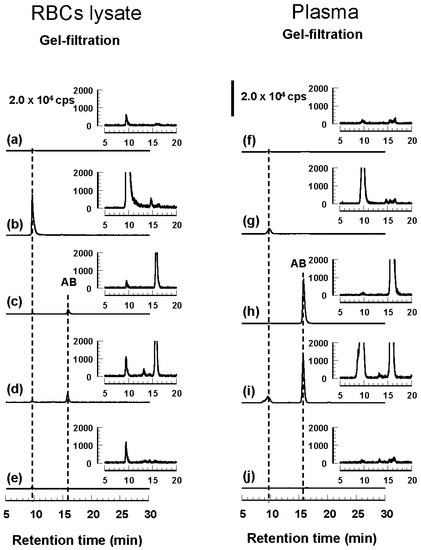 Figure 4 shows gel filtration column elution profiles of arsenic in RBC lysates (Figure 4a–e) and in plasma specimens (Figure 4f–j) derived from control rats (Figure 4a,f) and from rats treated with DMAV (Figure 4b,g), AB (Figure 4c,h), AC (Figure 4d,i) or TMAOV (Figure 4e,j). Two arsenic peaks were observed in the whole blood and plasma from DMAV-treated animals (Figure 4b,g). The major peak at the void volume appeared to correspond to protein-bound arsenicals, while the minor peak was eluted at the same retention time as that of authentic DMAV (Figure 3a and Figure 4b,g). The elution profiles of plasma in both AB- and AC-treated groups showed the major peak at the same retention time as that of AB; however, the minor peak at the void volume was observed only in the AC-treated group (Figure 4h,i). For the TMAOV-treated group, the elution profiles were similar to those observed in the control group (Figure 4a,e,f,j).