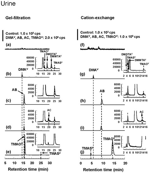Elution profiles of 0–24-h urine in rats after oral administration of: (a,f) deionized-distilled water (control); (b,g) DMAV; (c,h) AB; (d,j) AC; or (e,j) TMAOV. Samples were separated by (a–e) gel filtration or (f–j) cation-exchange and assayed by HPLC-ICP-MS. A 20-μL sample was applied to the columns, which were eluted with the pre-filtered (0.22 μm) mobile phase (see Table 1 for the elution conditions). The vertical bars indicate the level of detection (counts per second, cps) for the main panels; separate scales (in cps) are provided for the insets.