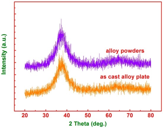 X-ray diffraction (XRD) patterns for the as-cast alloy and consubstantial alloy powders.