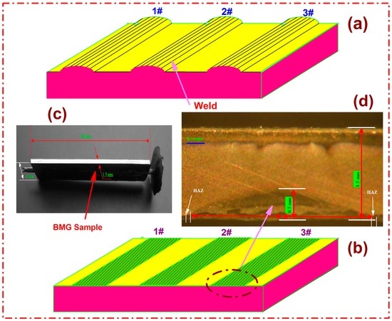 Microstructures of the surfaces and interfaces in materials are important factors to determine their performances [1,2]. Due to their unique structures and properties, amorphous materials have attracted the extensive attention of researchers [3,4,5]. At present, with science and technology changing with each passing day, the new material industries have been greatly developed. New materials, including amorphous materials [6], are gradually moving from the laboratory to engineering applications, promoting the continuous progress of human societies. It is well known that metallic glasses, including bulk metallic glasses (BMGs), are ideal model systems of dense random packing [7,8]. Compared to crystalline materials, BMGs have a homogenous composition structure, i.e., an isotropy structure. Due to their special matrix structure, BMGs possess many excellent properties that crystalline materials lack and that can serve as potential structural and functional materials in the future in engineering applications, sports equipment, scientific research, and so on [9,10]. BMGs have been found in many different alloy groups, such as Pd-, Mg-, Ln-, Ti-, Fe-, Co-, Ni-, Ca-, Zr-, and Cu-based systems [3], and new alloys have been fabricated and reported with a variety of different properties. Nowadays, a substantial amount of research has been carried out and is being carried out on BMGs investigating their structural and thermal stabilities, mechanical properties, fracturing behavior, preparation and glass-forming abilities, and so on [11,12]; meanwhile, impurity diffusions in the amorphous alloys have been studied primarily [13,14,15]. However, in BMGs, the welding performance research, which is an important field that should be carried out and has close relations to mechanical properties and structural and thermal stabilities, have rarely been reported. The importance of weldability in BMGs can be externalized in two aspects as described below. (1) In practical applications, the structural or functional materials with complex external shapes are being widely exploited. However, most reports in academic literature for BMGs only focus on simple shapes, achievable with simple molds [16,17,18]. The glass forming abilities (GFAs) and preparation methods have confined the synthesis of complex BMG parts. Eventually, the simple shapes, such as those that are rod-like, plate-like, and tube-like shapes, significantly limited the applications of BMGs, wherein welding is the simplest and most effective approach to settle the above-mentioned problems. (2) Papers on welding performances in BMGs are very few [19,20,21]. Whether welding would affect or modify the BMG matrix structures, or the thermal stabilities and properties, is not clear. Therefore, the weldability research for BMGs is of great significance.