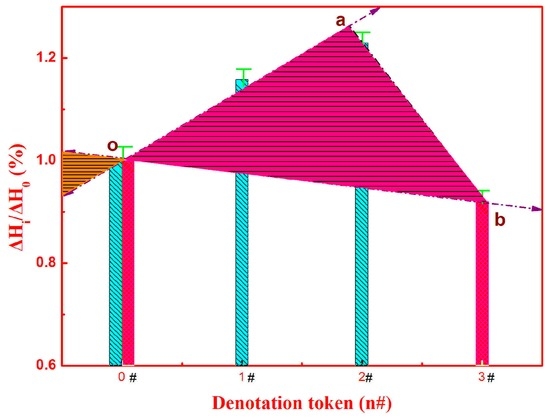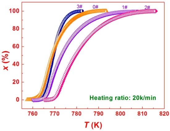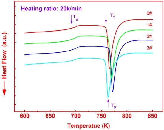 After laser welding procedures, all the removed semicircle mulches, corresponding to the welds denoted as 1#, 2#, and 3#, respectively, were further verified by XRD. The XRD patterns (not shown in the present paper) validate again the amorphous nature of the welds. Figure 3 exhibits the differential scanning calorimetry (DSC) curves measured at a heating rate of 20 K/min for 0#, 1#, 2#, and 3#, respectively. The glass transition temperatures (Tg), the onset temperatures of exothermic reaction (Tx), the crystallization exothermic peak (Tp), the super-cooled liquid regions ∆Tx = (Tx − Tg) of the matrix, and welds are summarized in Table 1 and shown in Figure 4. Tg, Tx, Tp, and ∆Tx of the amorphous matrix were measured to be 690.6, 758.9, 765.83, and 68.3 K, respectively. With the energy inputs, Tg is largely unchanged, while Tx and Tp both presented a certain change trend, i.e., their values first increased and then decreased. After laser welding, Tx was enhanced by 3.8 K for 1#, 6.3 K for 2#, and −2.6 K for 3#, respectively. Meanwhile, Tp was increased by 3.8 K for 1#, 6.2 K for 2#, and −2.5 K for 3#, respectively. ∆Tx was measured to be 71.9, 74.1, and 65.4 K for 1#, 2#, and 3#, respectively. ∆Tx of 1# increased by 3.6 K, while that of 2# increased more, reaching 5.8 K. With the further increase of energy, ∆Tx of 3# was 2.9 K less than that of 0#. Laser rapid melting and solidification processes have a certain effect on the thermodynamic parameters of the ZrCuNiAl BMG. The highest value of ∆Tx, 74.1 K, is obtained when the beam current is 80 mA, which is a relatively large value and indicates that the thermal stability against the crystallization of the weld of 2# has been enhanced and strengthened [23]. Figure 5 shows the crystallization volume fraction x as a function of temperature T under a heating rate of 20 K/min for the BMG and the three welds, respectively. All relation curves between x and T exhibit an S-like shape. With the increase of welding current, the crystallization rate of x vs. T descends gradually, indicating obvious kinetic effects in the crystallization events, i.e., the higher the welding current, the wider the temperature range for crystallization. Meanwhile, when the input current increases up to 100 mA, x/T rises and even exceeds that of the BMG matrix, which is very consistent with the DSC analysis.