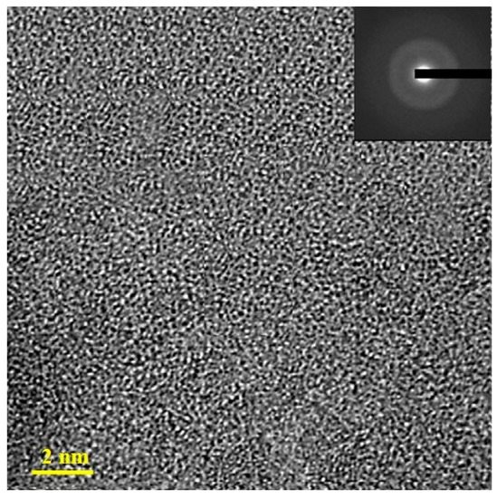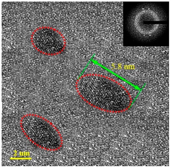 Figure 6 presents ∆Hi/∆H0 for the welds processed with different currents, where ∆Hi and ∆H0 refers to the released enthalpy through crystallization for the welds and the BMG matrix, respectively. The variation in the released enthalpy is the signal of increase or decrease of thermal enthalpy in a weld. If enthalpy in a weld increases, ∆Hi/∆H0 would be larger than 1, and vice versa. In Figure 6, along the oa straight line, ∆Hi/∆H0 increases gradually up to 16% for 1# and 23% for 2#, respectively. After oa and ab intersect, it varies along the ab straight line and eventually arrives to point b, i.e., ∆Hi/∆H0 lowers nearly 10%. In the selected current range in the present paper, variation of ∆Hi/∆H0 would be confined within the triangle oab. During the welding procedure, the energy inputs would melt local coating alloy powders and the BMG matrix to form a weld. Cooling down from a molten state to a solid state, the enthalpy level in the weld would change significantly. The increase in enthalpy could be attributed to the undersaturation of enthalpy produced during BMG fabrication, which offers a reserve capability for enthalpy when energy inputs are in progress. The 1# and 2# welds meet this situation, while for 3#, the increased enthalpy has exceeded the reserve capability, and redundant energy acts as the driving force in atomic rearrangement. Once the atomic rearrangements take place, enthalpy begins to decline rapidly. New enthalpy change area due to reverse energy inputs and local atomic rearrangement structural relaxation would form in the left triangle area created by the oa line and the ob line reverse intersection. The high-resolution transmission electron microscopy (HRTEM) images of 1# and 2# are very similar to that of 0#. For a comparison, the bright field images (BFIs) and selected area diffraction patterns (SADs) of 0# and 3# are demonstrated, as shown in Figure 7 and Figure 8, respectively. The TEM results show that there was no crystallization in 1#. Some crystalline phases could be observed in 3# even though crystalline phases could not be detected from the XRD pattern, indicating the occurrence of structural rearrangements during the welding procedure. Through measurement, the biggest dimensions of the precipitated crystallites are less than 6 nm, which can not be detected in the XRD pattern due to the sensitivity limits of XRD analysis methods. The TEM findings are very consistent with the results and analysis from Figure 3, Figure 4 and Figure 5. As to 1# and 2#, the increased enthalpies produced by the energy inputs have not exceeded the reserve capability of enthalpy in the BMG matrix. The newly forming atomic packing states would store more enthalpies, resulting in higher thermodynamic parameters and thermal stabilities as well as lower crystallization rates. For 3#, the enthalpy increases over its saturation, and, subsequently, large-scale atomic rearrangements have been activated, leading to the formation of precipitated crystallites. The precipitated crystallites could serve as the crystal nucleuses [24], resulting in a higher crystallization rate and subsequently lower thermodynamic parameter and thermal stability.