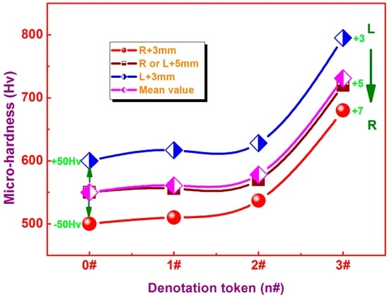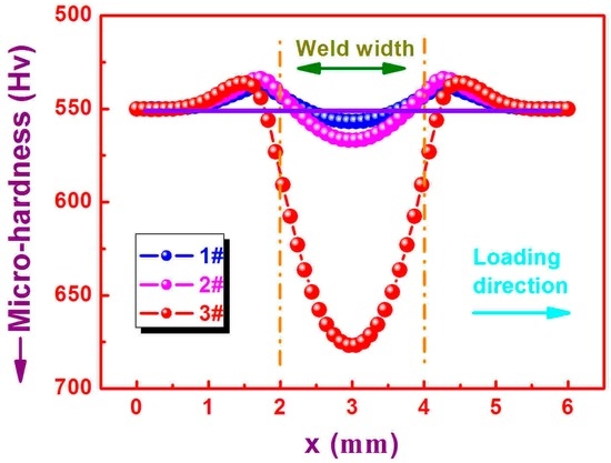Micro-hardness values are plotted for the BMG matrix and different welds as shown in Figure 9, where R + 3 mm refers to the micro-hardness values obtained from the measured spots 3 mm away from the right side, and R or L + 5 mm and L + 3 mm have similar implications. The mean micro-hardness in the BMG matrix is about 550 Hv. All datum groups exhibit similar trends, indicating the homogeneity for the mechanical property in the welds. When the current grows from 60 mA to 80 mA, the values in micro-hardness augment from about 2% to 5%, being attributed to the increased enthalpies in the welds and more mismatched extents in atom random stacking or packing [22]. When welding with a current of up to 100 mA, the micro-hardness in the weld rapidly increases by approximately 33% due to the formation of precipitated crystallites in the weld as illustrated in Figure 8. If the molecular dynamics were used to simulate the distribution of micro-hardness for each weld, the micro-hardness value in the weld as well as in both of its side areas could be plotted as shown in Figure 10. It can be found that, for all welding procedures, micro-hardness values in the HAZs would decrease. The maximum declines of micro-hardness in the HAZs could be calculated to be 3.8%, 4.6%, and 5.1% for 1#, 2#, and 3#, respectively. Then, the micro-hardness would increase gradually, and the maximum value would be observed in the center of each weld. The micro-hardness datum curve presents a basically symmetrical character. Compared with values from actual measurements, the micro-hardness in HAZs decreases by 2.2%, 2.9%, and 2.5% for 1#, 2#, and 3#, respectively, while that in the weld center increases by 1.9%, 3.1%, and 23.1%, respectively.