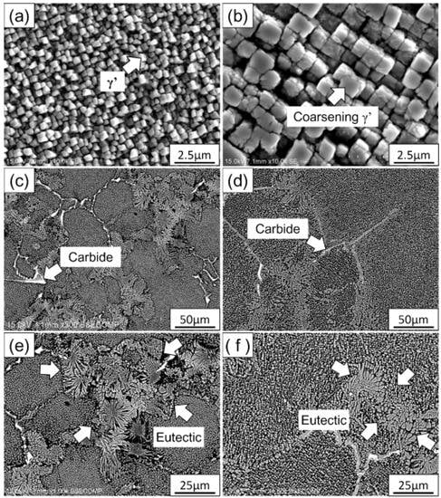 Microstructure of as-cast CM247LC before or after the HIP process: (a,b) are γ′s, (c,d) are carbides, and (e,f) are eutectics. Here, (a,c,d) are obtained before the HIP process, while (b,d,f) are obtained after the HIP process.