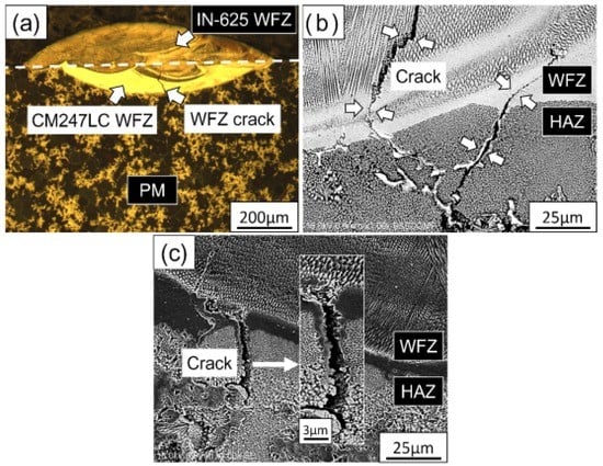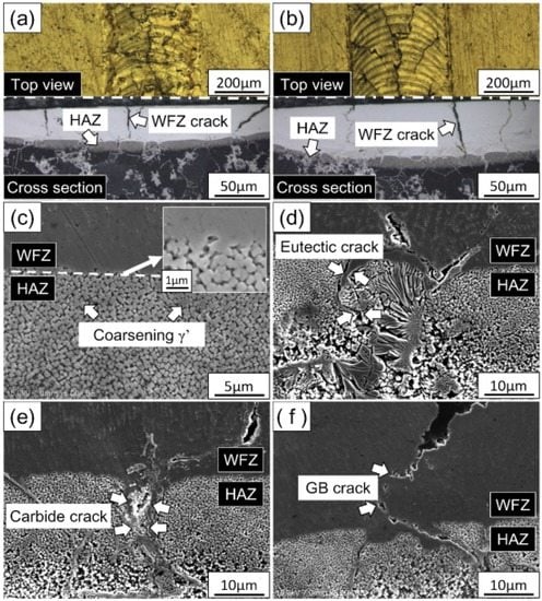CM247LC is a precipitation-strengthened nickel base superalloy that has an Al+Ti content exceeding 6 wt %. When a laser direct melting is conducted, various cracks (Figure 2a–f) are likely to occur during the solidification process. It is observed that in Figure 2a,b in Condition B or C, there are varying degrees of surface cracks and solidification cracks in WFZ, and that partial solidification cracks extend along the grain boundary from HAZ which penetrate directly through WFZ to the surface layer.