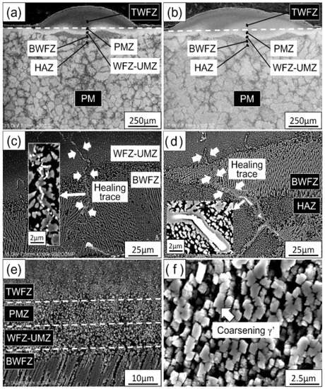After the 3 h high temperature and high pressure HIP process, various solidification cracks or liquation cracks in Condition B and Condition C (Figure 4a–d) have completely healed []. However, after the HIP process, different zones (Figure 4e) are observed in the WFZ of the repaired welded piece: TWFZ, partial mixed zone (PMZ) and WFZ un-mixed zone (WFZ-UMZ) [], and BWFZ and HAZ (Figure 4f). The HAZ resulting from WFZ overlapping is not obviously seen.
