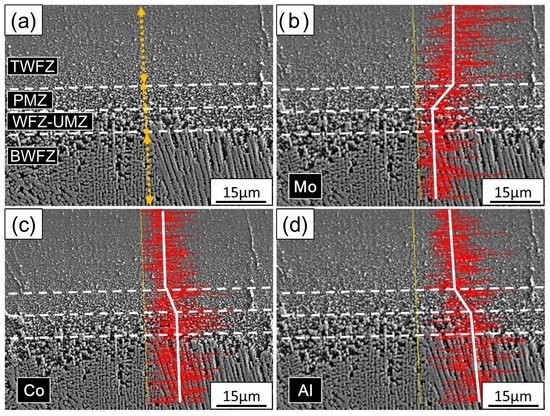 Figure 5a–d shows EDS linescan (including Mo (Figure 5b), Co (Figure 5c), and Al (Figure 5d) composition profiles) across BWFZ, WFZ-UMZ, PMZ, and TWFZ, suggesting the WFZ-UMZ unmixed the IN-625 filler wire.