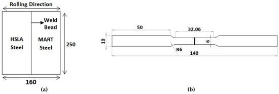 (a) Schematic illustration of the fiber laser welded steel sheets; (b) dimensions of the tensile test specimens. MART, martensitic steel.