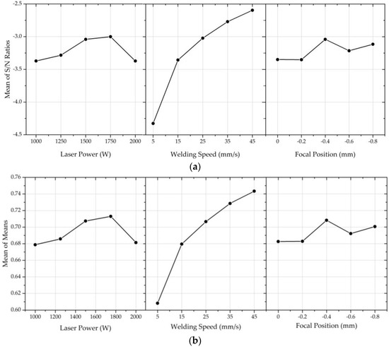 The S/N ratios’ main effect plot showed how each process parameter affects the response characteristic. The means of the S/N ratios exhibit a good correlation with the main effects of the mean of means (Figure 2). This result indicates that process parameters show higher mean values resulting in higher variability. The response seems to be mainly affected by the process parameters, as shown in Figure 2. It can be seen that the welding speed was the most important process parameter that affected the response. There was a small difference between laser power and focal position; while the focal position plots showed the lowest effect on the response to those parameters.