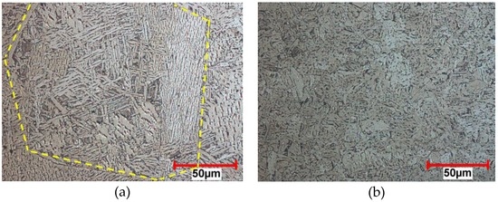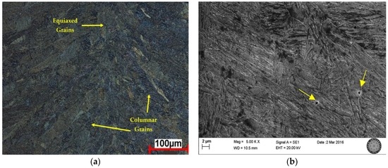 The microstructure of the FZ of Sample 20, with a 0.391 CE value (average of MART and HSLA steels), is predominantly martensite with a bainitic structure (Figure 5). With the effect of the heat exchange gradient, in the vicinity of the fusion boundary, grains were elongated towards the weld center. However, in the center of the FZ, equiaxed grains were observed (Figure 5a). Furthermore, due to the lack of shielding gas, as a possible result of the diffusion of some elements, i.e., oxygen and nitrogen from the air, it is thought to be some inclusions in the FZ, which were marked with yellow arrows in Figure 5b.