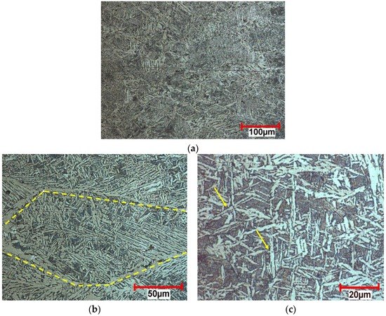 Weld zone microstructures of Sample 21, which have the highest heat input and, of course, slowest cooling rate, are completely different from Sample 20 and not associated with the CE values due to the slow cooling conditions. The FZ of Sample 21 consisted of ferritic microstructures with multiple morphologies, e.g., grain boundary, acicular and Widmanstatten (Figure 6a). Due to the oriented solidification and slow cooling rate, elongated and extremely coarse grains were revealed. In Figure 6b, grain boundaries were dashed with yellow, which contain different ferritic structures. Acicular ferritic microstructures can also be seen in Figure 6. The yellow arrows show the inclusions where acicular ferrites nucleated (Figure 6c).