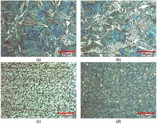In the CGHAZ and FGHAZ of the MART side of Sample 21, as a result of the higher CE, coarse baiting, ferritic and martensitic microstructures were identified (Figure 10a,b). The ICHAZ, in accordance with the Fe-Fe3C equilibrium diagram, consisted of fine ferritic structures with small portions of pearlitic structures (Figure 10c). As expected, under the influence of a relatively high temperature, which is in the range of martensite tempering temperatures, tempered martensite formed in SCHAZ of the MART side (Figure 10d).