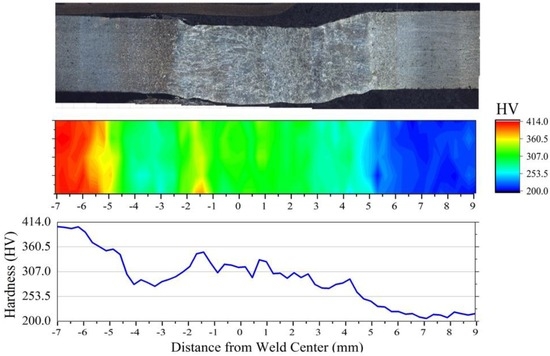 The microhardness map and profile of Sample 21 can be seen in Figure 12. The highest and the lowest microhardness values were measured in the BM of MART and HSLA, respectively. The highest value is related to the predominantly martensitic microstructure of the BM of MART steel. Among the weld zone of the MART steel, the ICHAZ showed the lowest microhardness corresponding with the ferritic-pearlitic microstructure. The measured microhardness values through the FZ showed a fluctuation, which can be a result of multiple morphologies of ferritic structures. In the HSLA side, microhardness values showed a decreasing trend up to the BM.
