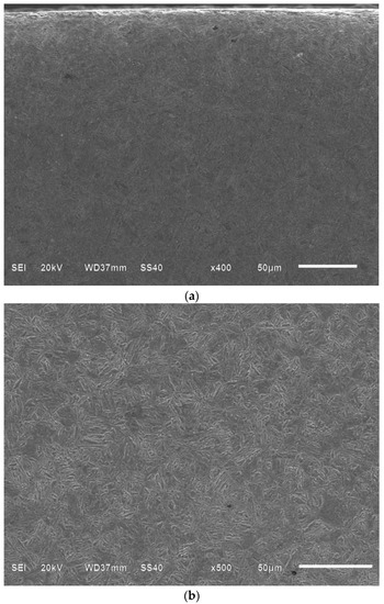 The investigated material in this study was a high-strength carburized 20Cr gear steel. Its main chemical composition (wt. %) is 0.18 C, 0.17 Si, 0.50 Mn, 0.03 S, 1.50 Cr, and 3.48 Ni. Specimens were first machined into hourglass shapes with a certain amount of finishing margin. Next, the heat treatment was carried out on the specimens. The heat treatment procedures were as follows: (a) carburizing process: carburized at 930 °C × 7 h + furnace cooling to 860 °C + air cooling; (b) normalizing process: 840 °C × 0.5 h + air cooling; and (c) tempering process: 650 °C × 6 h + air cooling. After heat treatment, the microstructure of the steel is tempered martensite, and the depth of the carburized layer is about 1.2 mm. After etching with 4% alcohol nitric acid solution, the martensites with high carbon could be observed by scanning electron microscopy (SEM) in the carburized layer (shown in Figure 1a). In the core region, the martensites with low carbon could be observed by SEM (shown in Figure 1b). Finally, specimens were ground in a direction perpendicular to the axis of the specimen by grades 600–2000 abrasive paper to final shapes, as shown in Figure 2.