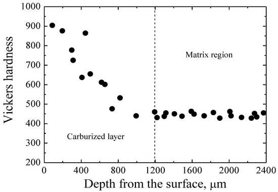 The minimum diameter and round notch radius of specimens are 6 mm and 47 mm, respectively. The Vickers hardness (HV) of the carburized layer and matrix region was measured by a nano-indenter G200, and its distribution as a function of the depth from the surface is presented in Figure 3. It can be found that first the value of HV on the surface is maximum, and then tends to decrease, finally approaching a constant of 455 at the depth exceeding about 1200 μm. Therefore, it can be further confirmed that the thickness of the carburized layer is about 1200 μm, and the value of HV for the matrix is about 455. In addition, the tensile strength of steel and the yield strength of 20Cr are 1483 MPa and 1292 MPa, respectively.
