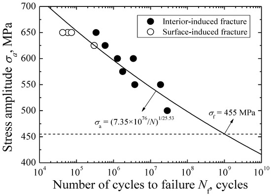 The S-N diagram of carburized 20Cr gear steel under axial loading with R = 0 is shown in Figure 4. There are two data points with fatigue lives exceeding 107 cycles. Furthermore, some maximum stress data exceed the yield strength slightly, but they do not have much influence on the experimental result. According to the SEM observation of all fracture surfaces, fatigue fractures of specimens can be divided into two modes: surface-induced fracture and interior-induced fracture. The surface-induced fracture occurs in the relatively high stress level with shorter fatigue life, whereas the interior-induced fracture occurs in the relatively low stress level with longer fatigue life. It can be confirmed that the interior-induced fracture is the predominant fracture mode of carburized 20Cr gear steel under axial loading in the life regime beyond 105 cycles. It should be noted that the so-called duplex S-N characteristics [3,7,11] cannot be distinctively observed. This can to some extent be attributed to the axial loading condition with the uniform stress distribution on the cross-section of the specimen. For the interior failure, it can be obviously seen that the relevant S-N property exhibits a continuously descending tendency, which is similar to the results of other steels with interior failure [1,3]. In view of the fact that the separation of test data corresponding to these two facture modes is not so clear, a single S-N curve is plotted to represent the HCF characteristics of carburized 20Cr gear steel under axial loading with a stress ratio of zero, as shown in Figure 4. Consequently, based on the fitting S-N curve, the fatigue strength corresponding to the fatigue life of 109 cycles, σf, is evaluated to be about 455 MPa.