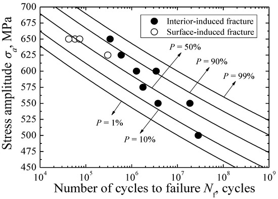 where s denotes the standard deviation in σa-value distribution, and μp is the standard normal variate corresponding to a given probability. In fact, the value of σa obtained from the S-N equation is just the value of σa under P = 50%. Thus, the values of σa at five survival probabilities, including 1%, 10%, 50%, 90%, and 99%, can be calculated, and the relevant P-S-N curves are plotted in Figure 5.