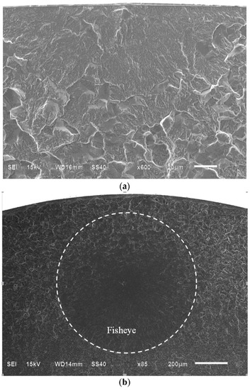 The change from surface-induced fracture to interior-induced fracture is the typical fracture feature of some high-strength steels in the long life regime [3,5,6,7,8,9,10]. Some metallurgical defects, such as non-metallic inclusions [3,4,5,6,7,8] or inhomogeneous microstructures [9,10] can play a very important role in causing the interior crack initiation. A propagating fisheye-shaped crack can be observed on the fracture surface. Furthermore, a characteristic rough area indicating fine granular morphology—called “FGA” (fine granular area) by Sakai [11]—can sometimes occur around the defect. Thus, it can be concluded that the fatigue property of high-strength steel is greatly related to the characters of fisheye, FGA, and inclusion, such as their sizes and positions. However, the relevant S-N properties and failure mechanisms are not yet well understood [4,8,12]. One of the major reasons is that the interior crack cannot be observed and measured during the experiment. Furthermore, from the viewpoint of safety design, the reliability of steel components in actual service can be affected by the maximum sizes of defects contained in a certain bearing volume of steel [13,14,15,16]. How to reliably evaluate the maximum defect size, and then to predict the fatigue strength corresponding to a certain fatigue life, has been a key problem which researchers have to face.